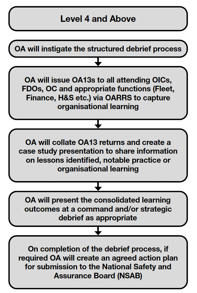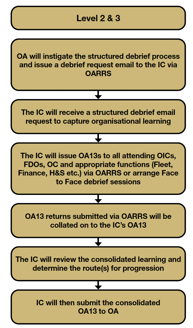 151. The Service details that all L4+ incidents require a formal structured debrief process and that they shall be coordinated and managed by the OAD (Figure 6). On conclusion of a L4+ incident, OAD issue an OA13 via OARRS to all attending OiCs, FDOs, OCs and appropriate support functions, where applicable (e.g. Fleet and Equipment Workshops, Finance, etc.). OAD also arrange for debrief submissions from partner agencies if applicable. OAD collate all OA13 returns, consolidate the learning and create a case study (CS) presentation to share information on the positive aspects, the challenging aspects and action(s) that have been taken or are required to be taken to improve performance. If required, the key aspects are presented at a strategic debrief, and shared throughout the Service at a later time via a CS presentation, FLU, or UI etc.