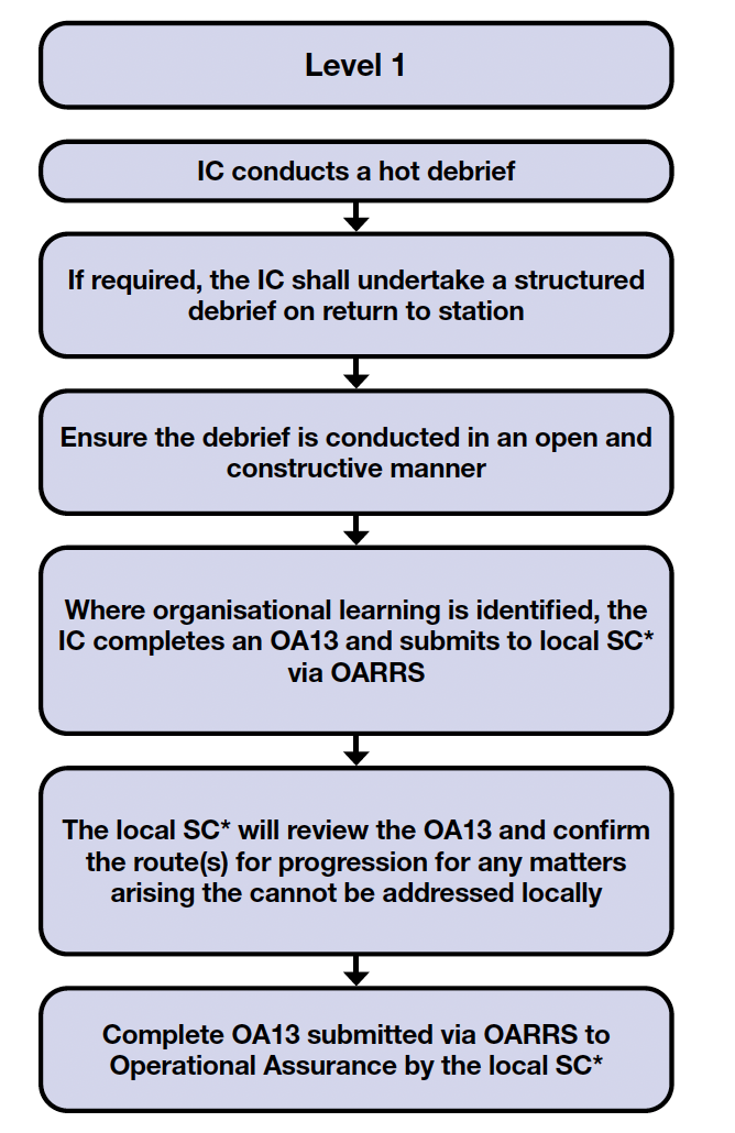 142. On conclusion of a L1 incident, the IC is required to conduct a hot debrief and, if appropriate, should then undertake a structured debrief on return to station (Figure 4). If a structured debrief is required, the IC should consider the inclusion of all other parties involved, i.e. OC, Police, Ambulance, etc. Where OL is identified that cannot be addressed at a local level, the IC should complete an OA13 on OARRS and submit the debrief report to the respective local SC responsible for the station area where the incident occurred. The reason for submitting the OA13 to the respective local SC is to ensure that local matters arising are addressed promptly, e.g. lack of Operational Intelligence (OI), multi-agency issues, poor water supplies, etc.