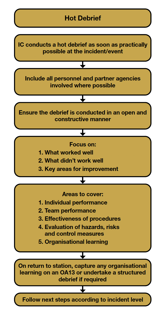 137. Staff were very conversant with the hot debrief process and provided a lot of good evidence surrounding the positive use and learning from this form of debrief being conducted at incidents. We found that the process in Figure 3 was generally followed well and there was an expectation that a hot debrief would be completed at any operational incident of note. In most instances, staff used the hot debrief immediately after an incident but there was a level of pragmatism regarding its application depending on the type of incident, weather conditions, welfare consideration, exposure to contaminants, ongoing incident ground risk etc. In such instances staff were more than comfortable conducting the debrief back at a workplace when it was more appropriate. Figure 3 - Hot Debrief process